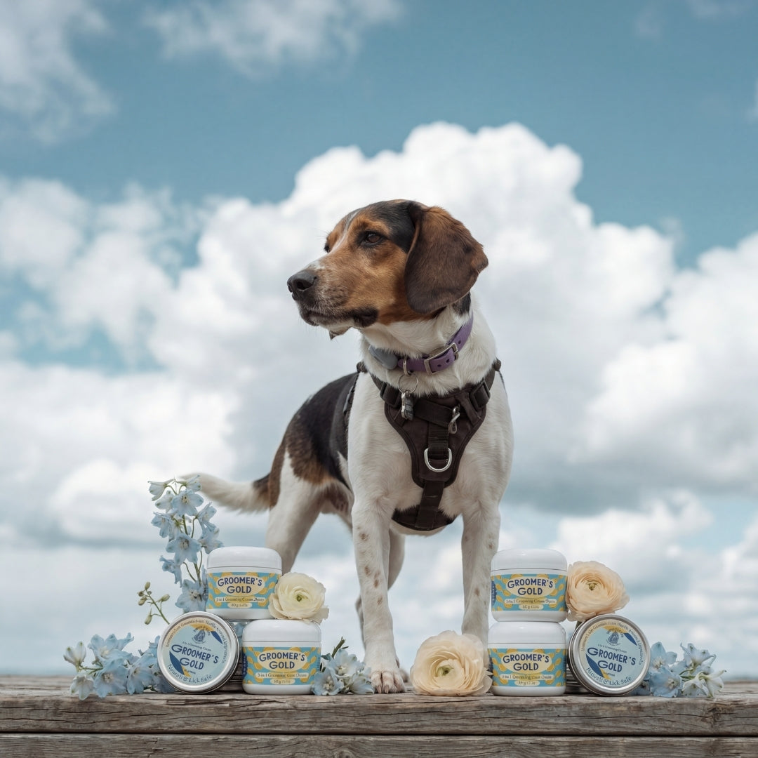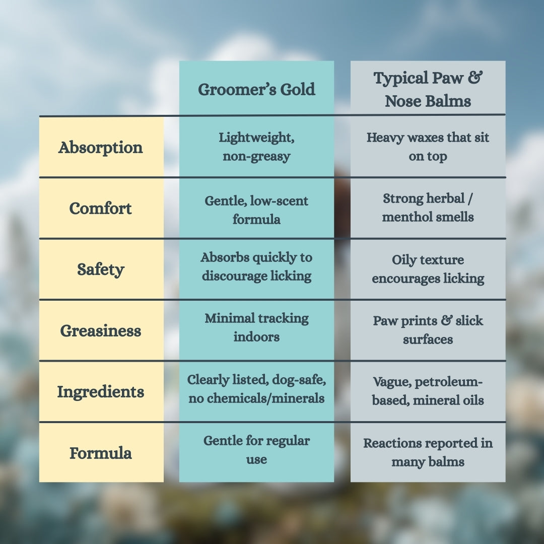 Groomer's Gold is a natural 3-in-1 grooming cream that works as hard as you do to keep your dog comfortable, protected, and feeling their best. Whether you're soothing rough paw pads after a winter walk, conditioning a dry nose, or caring for sensitive spots that need a little extra love, this balm does it all! It can even be used on your dog's fur as a protective shield ;) Made without chemicals, synthetic fragrances, or anything you can't pronounce.